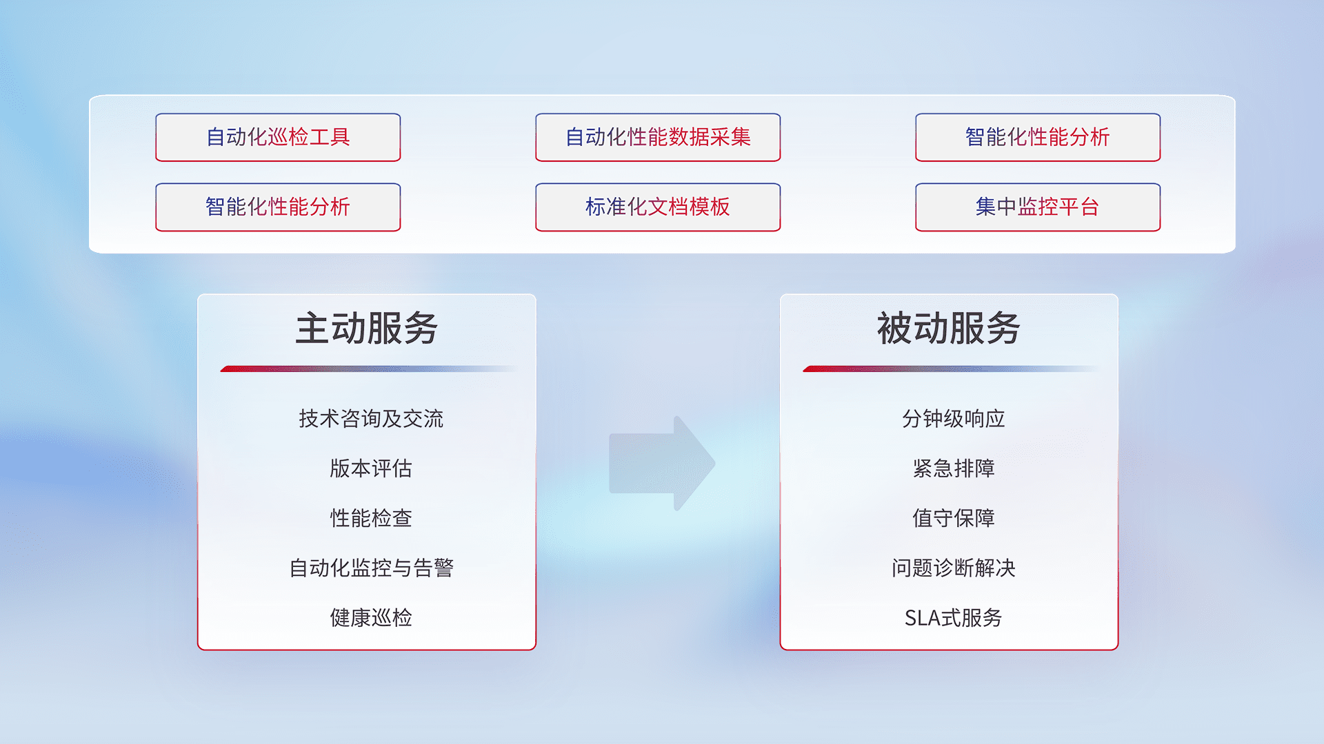 智能化工具和标准化文档,,,,保障服务质量,,,,提供主动服务(包含技术咨询、、、、版本评估、、、性能检查、、、、自动化监控与告警、、、、健康巡检)和被动服务包含(分钟级响应、、、紧急排障、、、值守保障、、、、问题诊断解决、、SLA服务)。。。。